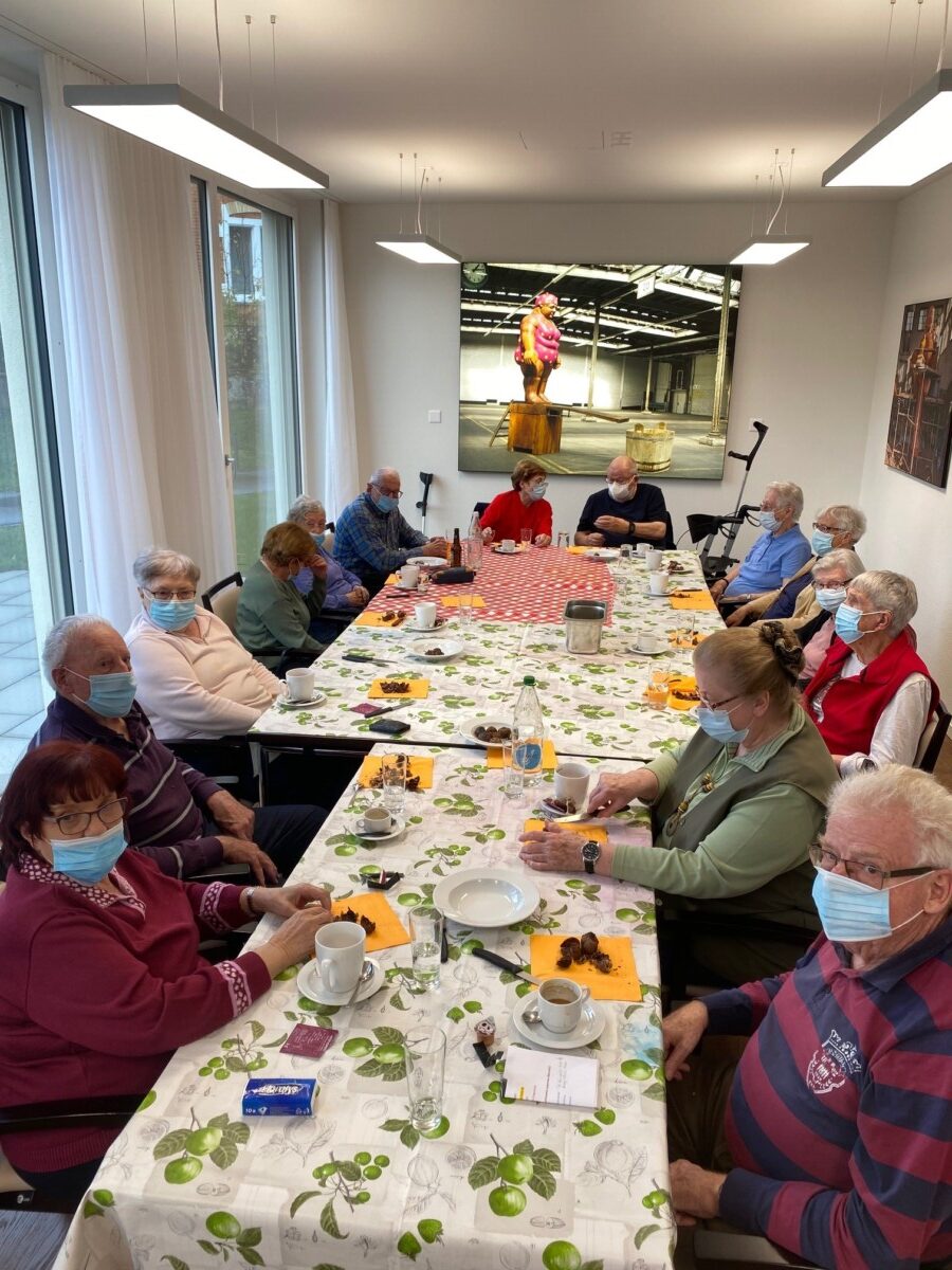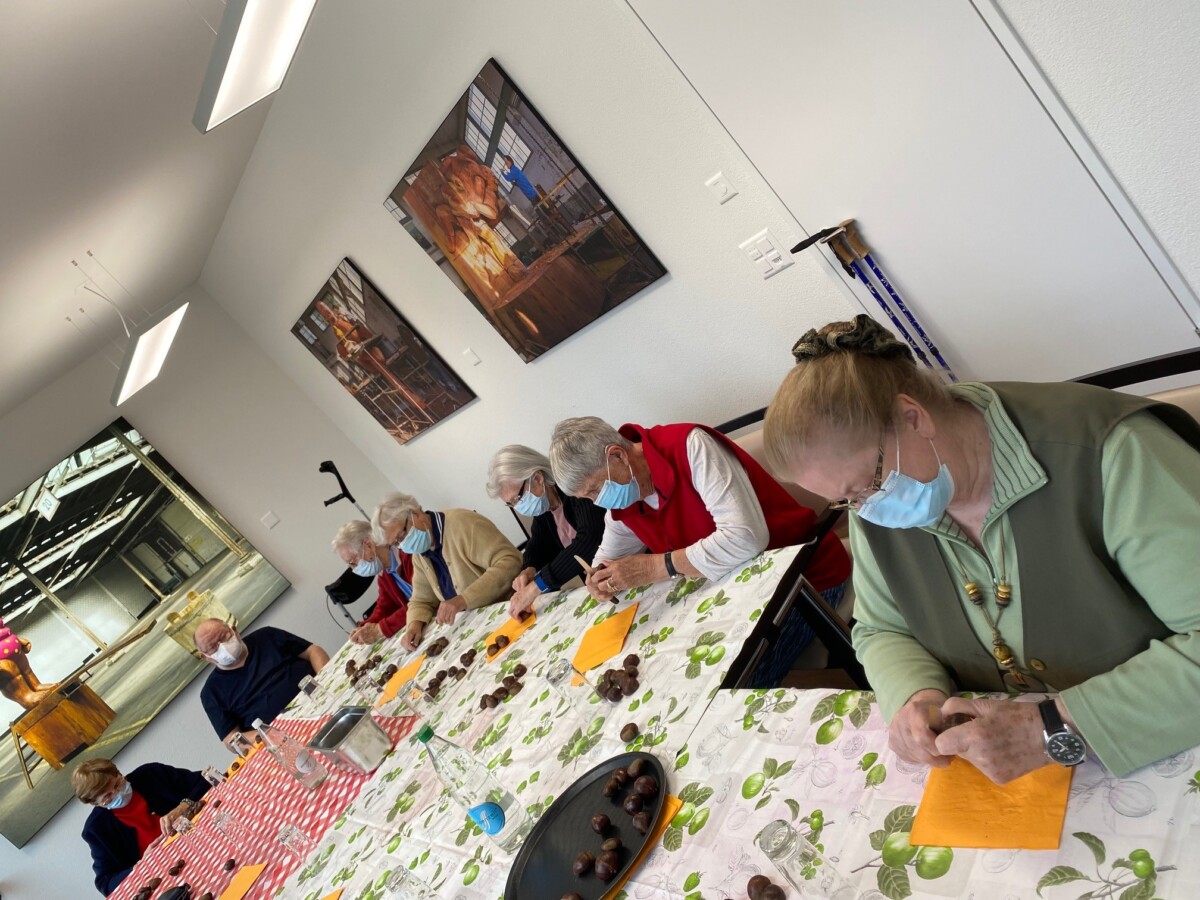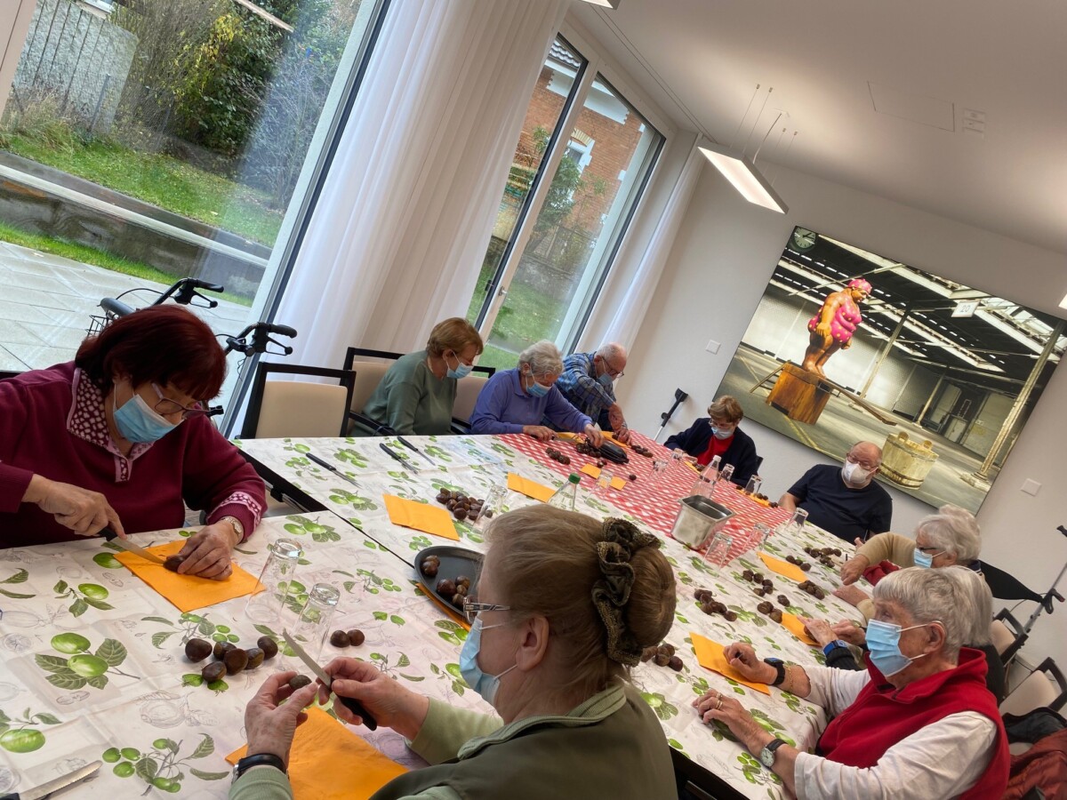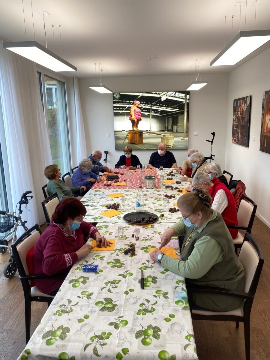 Wir hatten heute alle Hände voll zu tun. Zuerst wurden die Marroni von den Seniorinnen und Senioren geschnitzt und dann haben wir sie in zwei Marroniöfen geröstet. Anschliessend durften wir unseren Fleiss gemeinsam geniessen. Einer unserer Senioren hat uns zusätzlich mit seiner Mundharmonika überrascht und etwas vorgespielt.