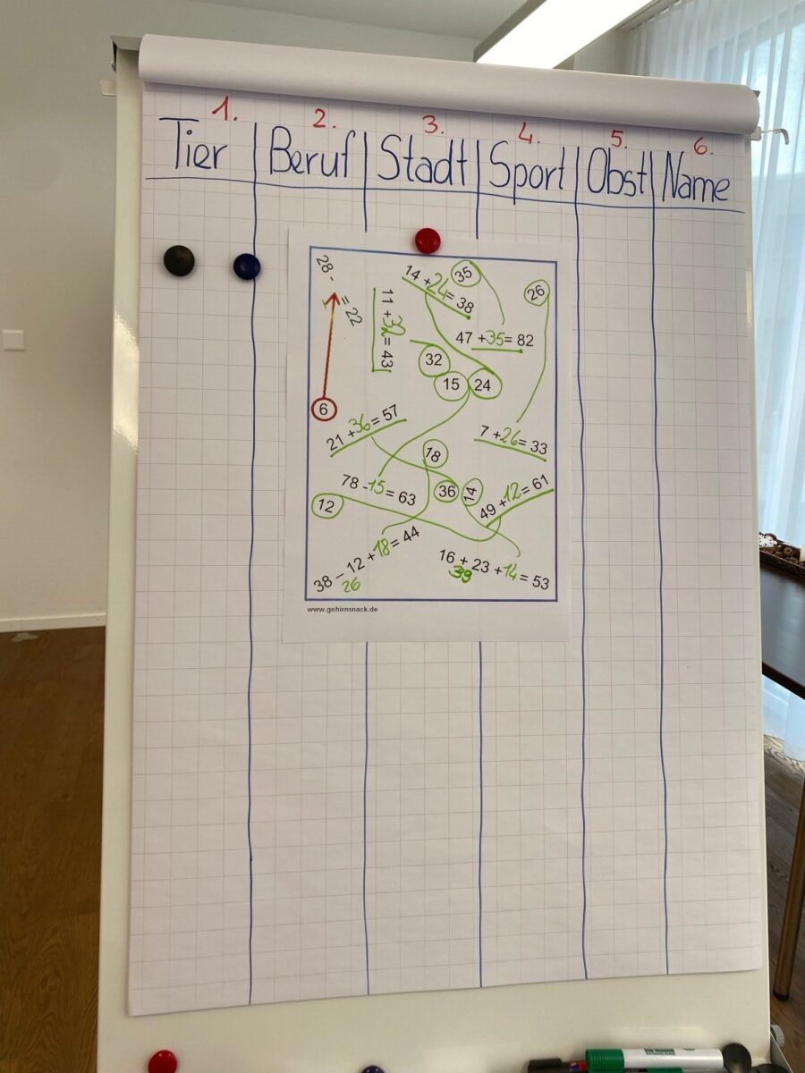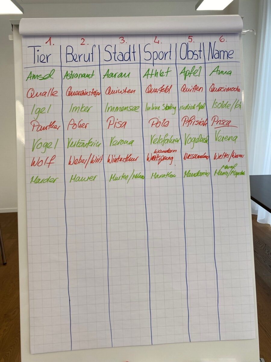 Heute wurde getuschelt, gerätselt und nach der richtigen Antwort gesucht. Als erstes durfte jede und jeder einen Namen der Gruppe ziehen und zehn Adjektive zu der Person nennen. Es war lustig zu sehen, wie viele Senioren, dieselben Eigenschaften wählten. Dann gab es knifflige Mathematik-Aufgaben und ein Kreuzworträtsel zu lösen. Anschliessend suchten wir verschiedene Dinge und Orte, die mit demselben Buchstaben begannen. Zum Abschluss gabs noch einen feinen Kuchen und Kaffee persönlich serviert von unserem Küchenchef.