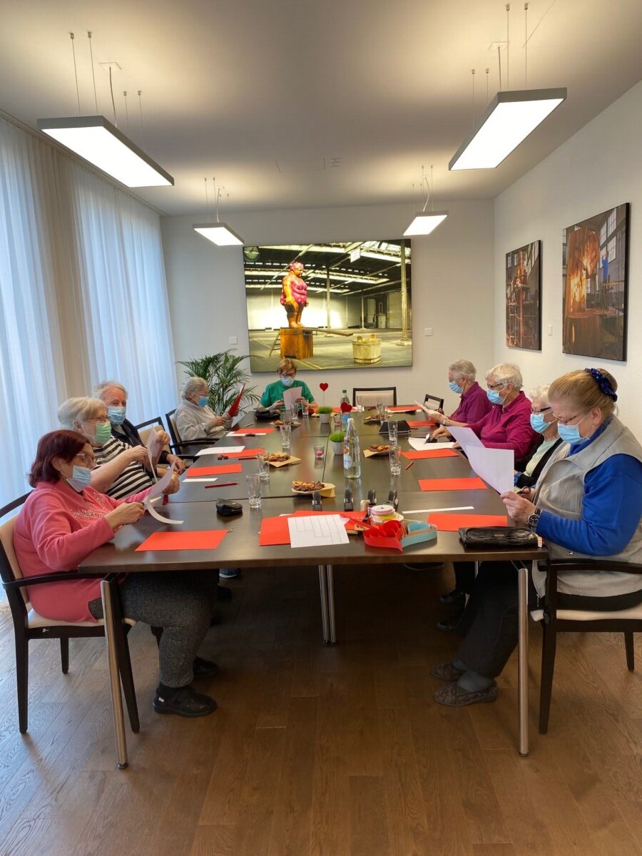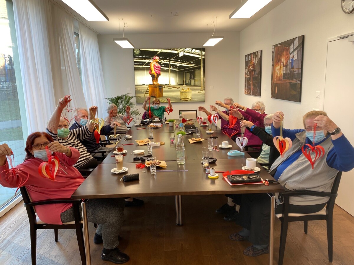 Unsere romantische Ader kommt heute zum Zug. Wir haben mit 6 Papierstreifen in verschiedenen Längen, ein Herz zum Valentinstag gebastelt. Nach unseren schönen Kreationen wurden wir, wie immer, mit Kaffee und Gebäck überrascht.