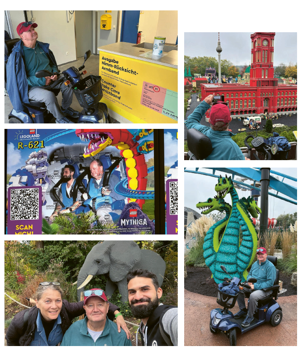 Letzten Oktober ging für ihn ein grosser Traum in Erfüllung: ein Ausflug ins Legoland. Die Vorfreude auf diesen besonderen Tag war riesig, und Herr Kuster strahlte vor Begeisterung, als er die beeindruckenden Nachbildungen von weltbekannten Wahrzeichen aus Lego bestaunen konnte. Vom kleinsten Modell, einer winzigen Taube aus nur sechs Legosteinen, bis hin zur siebeneinhalb Meter hohen Giraffe, die majestätisch über den Park wacht. Doch das absolute Highlight war die Fahrt auf einer Achterbahn. Trotz seiner körperlichen Einschränkungen erlebte er diesen Moment voller Freude und Abenteuerlust. Die Unterstützung seiner beiden Begleiter Samir und Jacky, die mit viel Herz und Einsatz an seiner Seite waren,