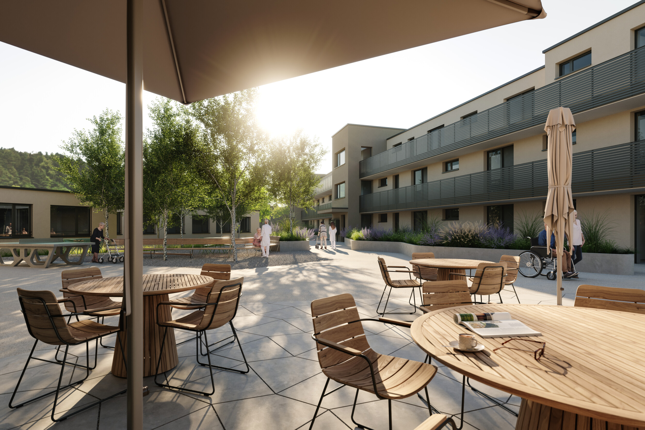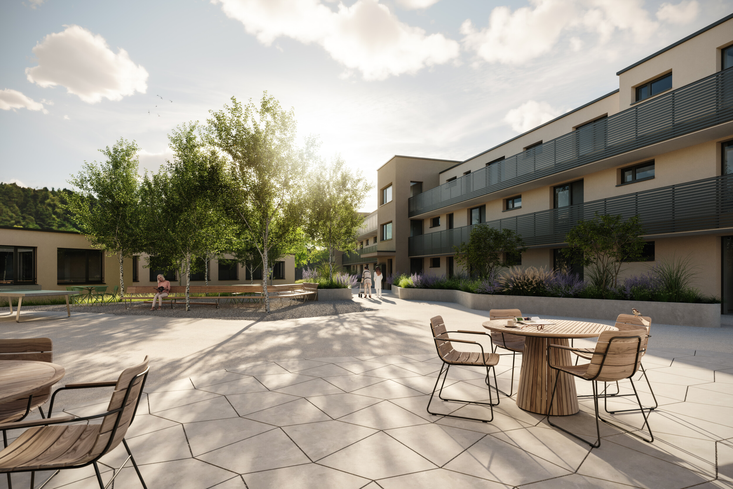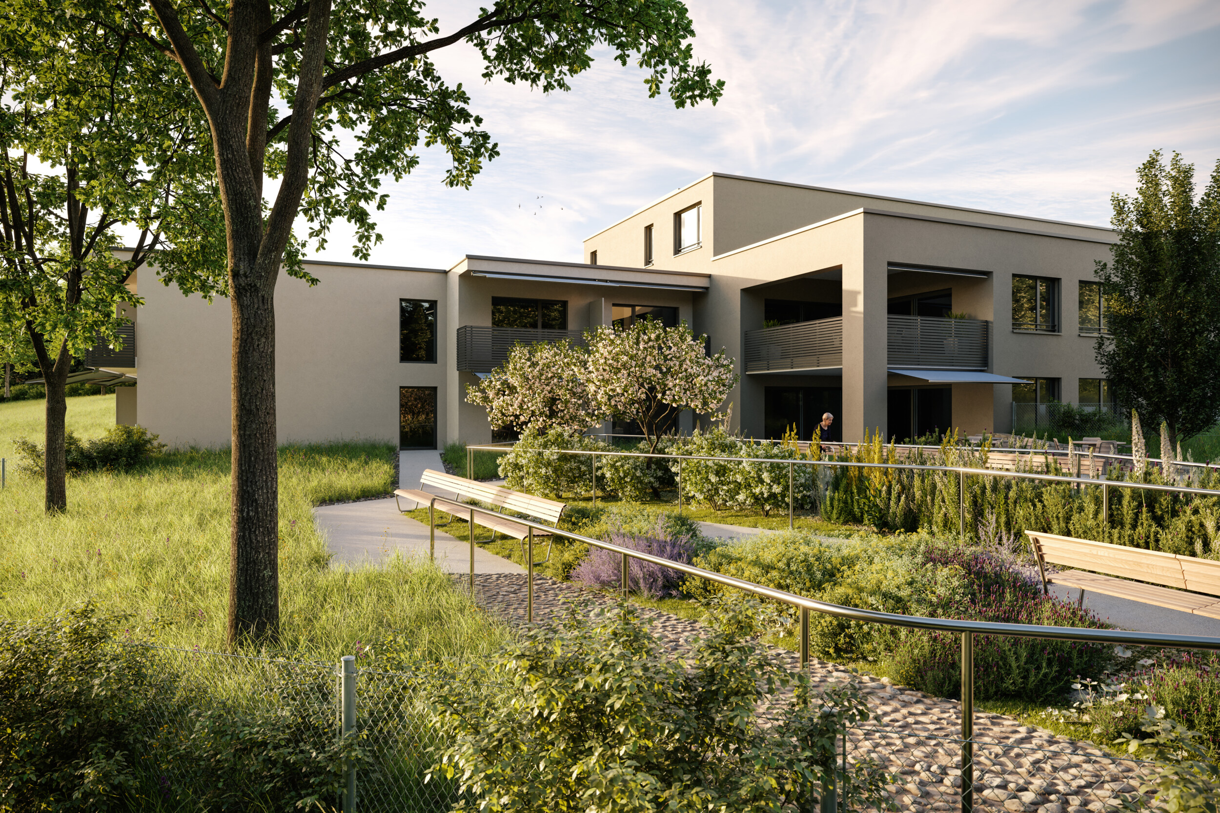 Die moderne Seniorensiedlung bietet autonomes Wohnen in der eigenen Wohnung mit pflegerischen und hauswirtschaftlichen Dienstleistungen über 24 Stunden. Ergänzt wird das Angebot mit öffentlichem Restaurant, Physiotherapie, Fitness- und Gemeinschaftsräume sowie Podologie und Coiffeur.